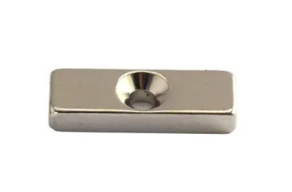 Magnet neodim bloc paralelipipedic (drepunghiular) puternic cu orificiu conic pentru holsurub. Lungime 30mm (3cm), latime 10mm (1cm), grosime 5mm (0,5cm).